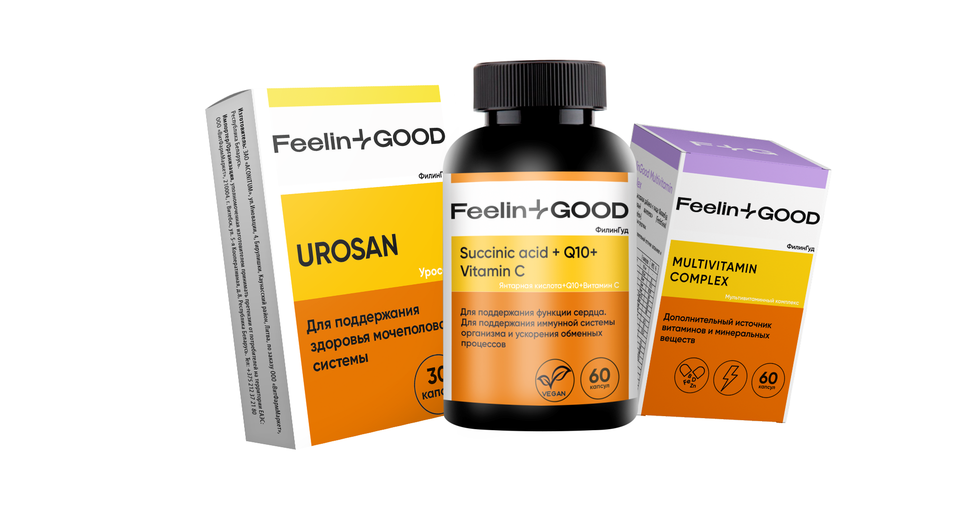 Качество лежит в основе всего, что мы делаем, и именно поэтому ассортимент нашей продукции разработан с учетом самых высоких европейских стандартов. Многолетний опыт и глубокие знания эффективности и биодоступности, которыми мы руководствуемся в своей работе, отражаются в эффективности наших продуктов. FeelinGOOD - это не просто биологически активные добавки, это источник здоровья и энергии, который поможет вам быть на пике формы каждый день. Наши продукты разнообразны и адаптированы под различные потребности и цели: для улучшения физической выносливости, поддержания иммунной системы, улучшения состояния кожи, восстановления после физических нагрузок и многое другое. Для нас производство качественных и эффективных пищевых добавок означает постоянный прогресс. Поэтому наша команда экспертов обеспечивает постоянное дальнейшее совершенствование продукции. Основываясь на последних научных открытиях, мы разрабатываем оптимально дозированные биологически активные добавки. Выбирая FeelinGOOD, вы выбираете надежность, качество и заботу о себе. Доверьтесь нам и чувствуйте себя хорошо каждый день!